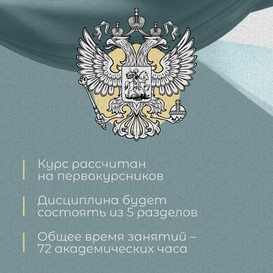 Итак, «Основы российской государственности» будут преподавать студентам первых курсов всех специальностей. Курс будет рассчитан на 72 академических часа, из них больше всего отдадут разделам про российское мировоззрение и вызовы будущего. Особенно важно, что дисциплина не будет состоять из обычных скучных лекций. В нее войдут интерактивные занятия, экскурсии, дискуссии, дебаты, художественные материалы и многое другое.